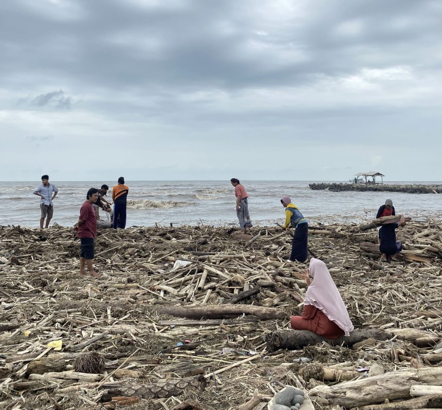 Seiring surutnya arus banjir, material kayu terus terbawa dan terdampar di kawasan pantai.
